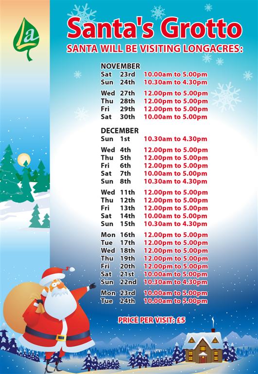 We have Santa's Grotto here at Longacres, which has been lovingly built by our talented team of florists and seasonal staff. It was a lot of hard work but all the staff involved in putting together this project agree that is it completely worth it to see the look on the children's faces as they are lead through the winter wonderland and sat down in the grotto with Santa. We have had some fantastic feedback both in person and on our Facebook page about the experience and how much people's children have enjoyed meeting Santa. We'd like to say a big thank you, it makes all the work all worth while to know that it has been such a hit! If you'd like to come and have a look for yourself we have posted the opening times below.