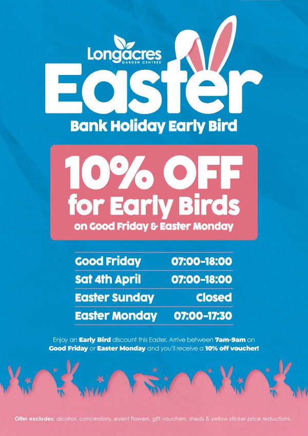 The early bird catches the worm, or in this case – a deal! Head instore on either Good Friday (3rd April 2026) or Easter Monday (6th April 2026) and grab yourself 10% off* purchases made at the tills.