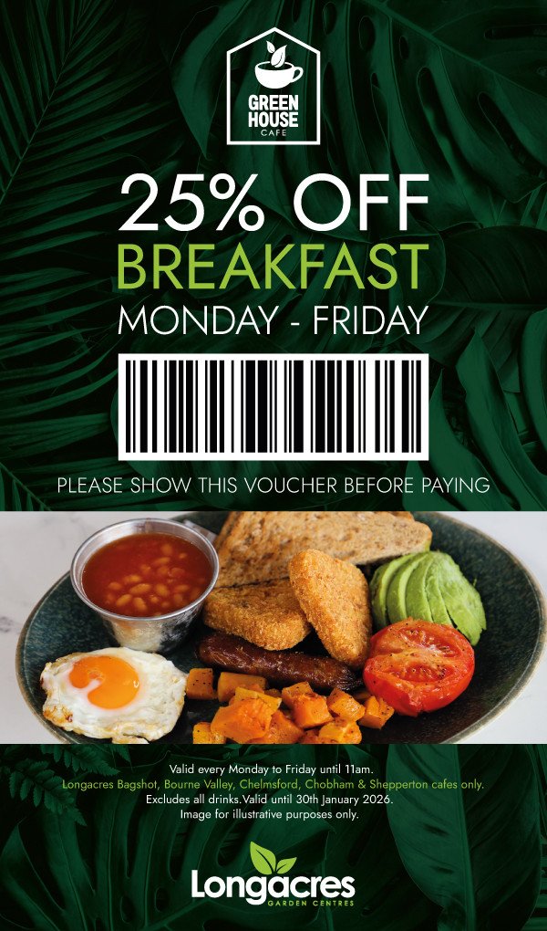 Looking for an excuse to treat family and friends to a cooked breakfast? Then look no further! Save 25% on breakfast at The Green House Cafe when you next visit Longacres Bagshot, Longacres Bourne Valley, Longacres Chelmsford, Longacres Chobham or Longacres Shepperton. To grab your savings, simply show the barcode below to the cashier when paying for your order in our Cafe. The voucher is valid Monday to Friday from opening to 11am, until 30th January 2026. To make the most of these savings, this voucher can be used more than once, giving you a reason to visit us every week day.