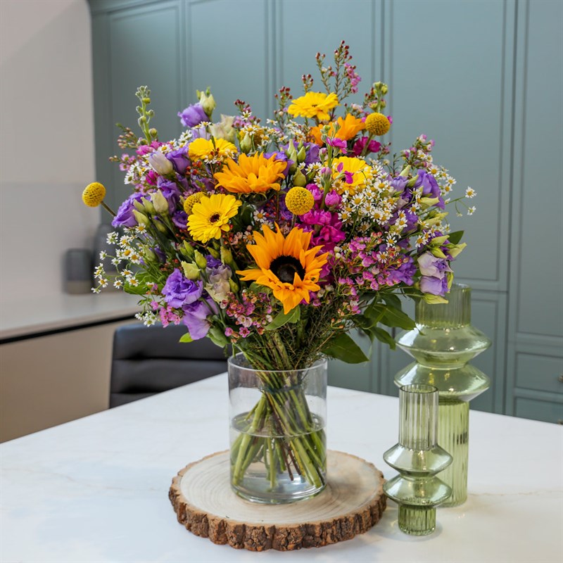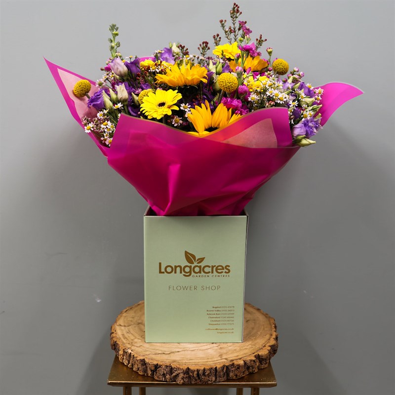 This bouquet consists of sunflowers, lemon gerberas, cerise stocks, lilac lisianthus, cerise wax flower, yellow craspedia and daisy tanacetum set amongst a variety of seasonal foliage and beautifully gift-wrapped in a presentation box.