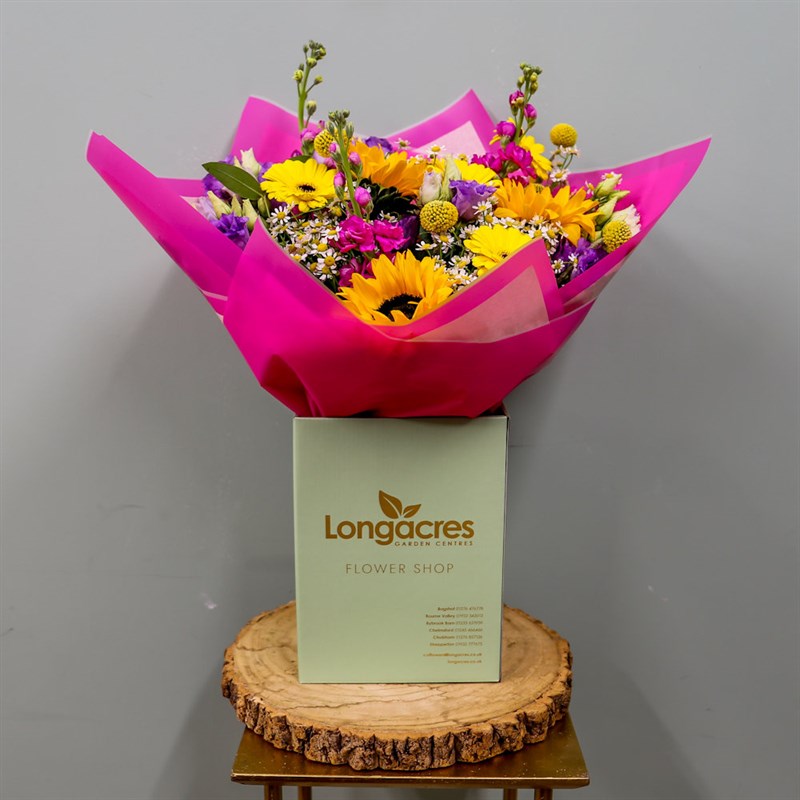 This bouquet consists of sunflowers, lemon gerberas, cerise stocks, lilac lisianthus, yellow craspedia and daisy tanacetum. set amongst a variety of seasonal foliage and beautifully gift-wrapped in a presentation box.