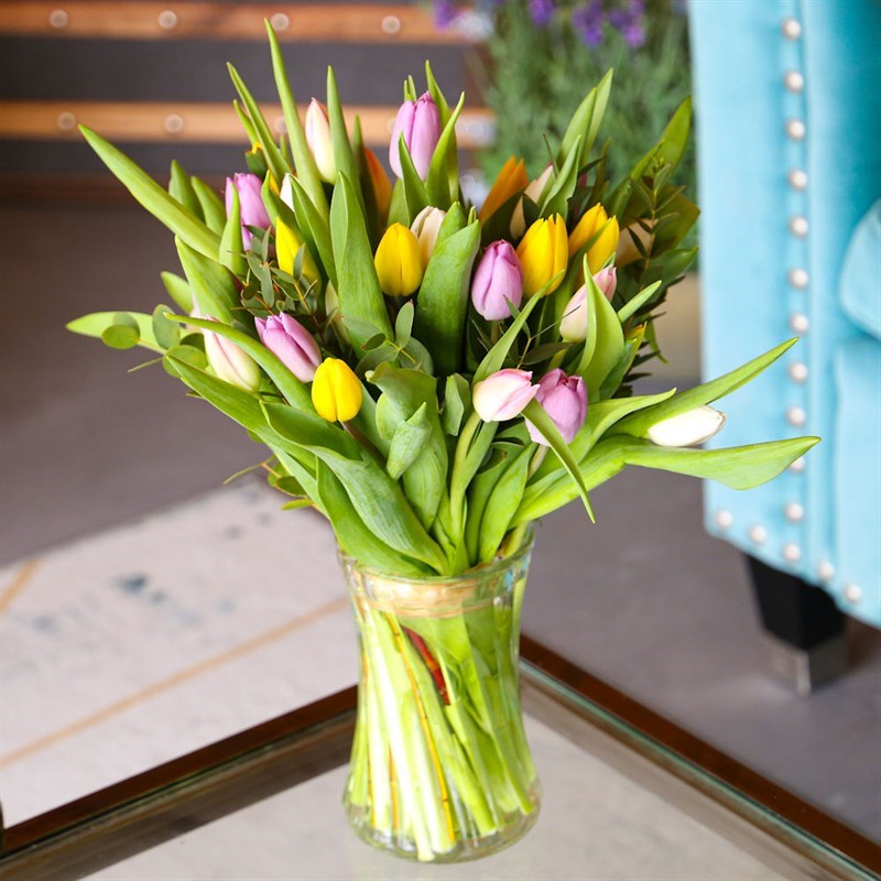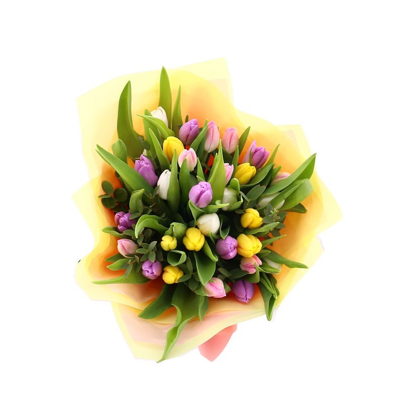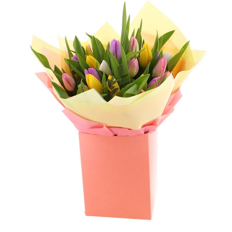 About this arrangement: Gift someone this beautiful floral handtied arrangement. Consists of Pink Tulip, Lilac Tulip, Yellow Tulip, White Tulip and Pavi. All of our bouquets are set amongst of seasonal foliages beautifully wrapped in tissue paper in a presentation box. As well as this, their stems are kept in water, so our flowers will stay fresh for their journey.