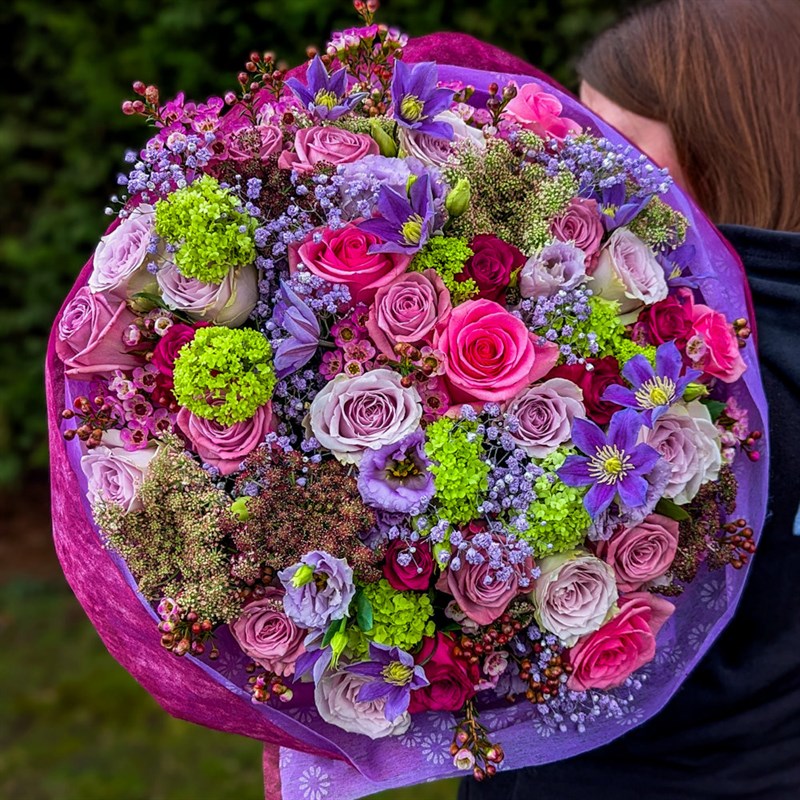 This bouquet consists of roses, gypsophila, viburnum, clematis, Queen Anne's lace and wax flower, set amongst a mixture of seasonal foliage and beautifully gift-wrapped in a presentation box.