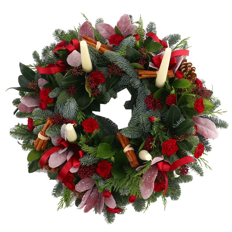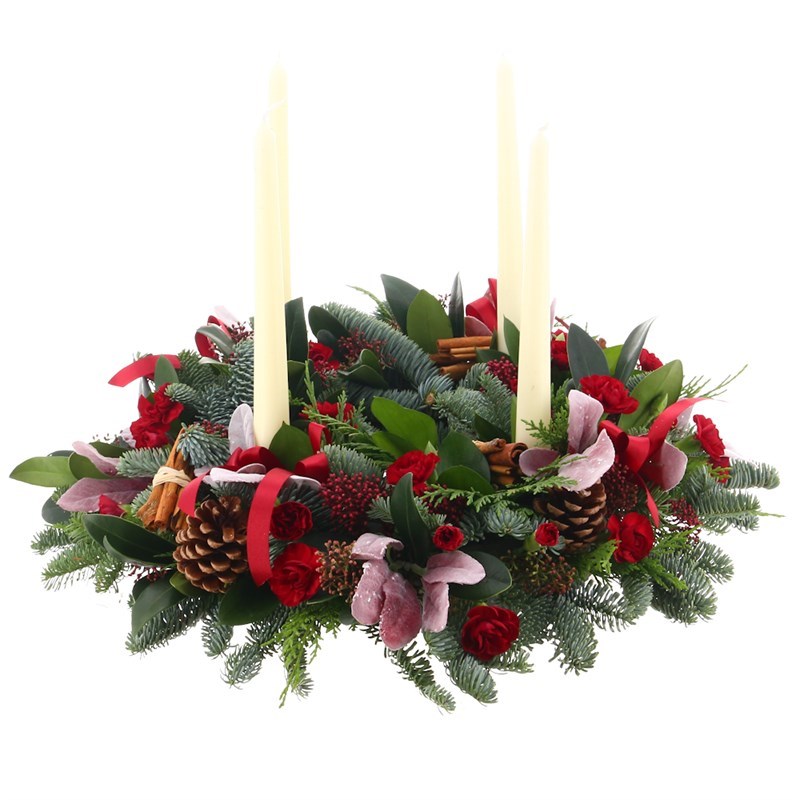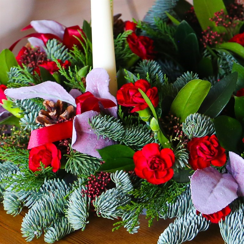 About this arrangement: Consists of Spruce, Skimia, Spray Carnations and Candles. Set amongst seasonal foliages and seasonal decorations.