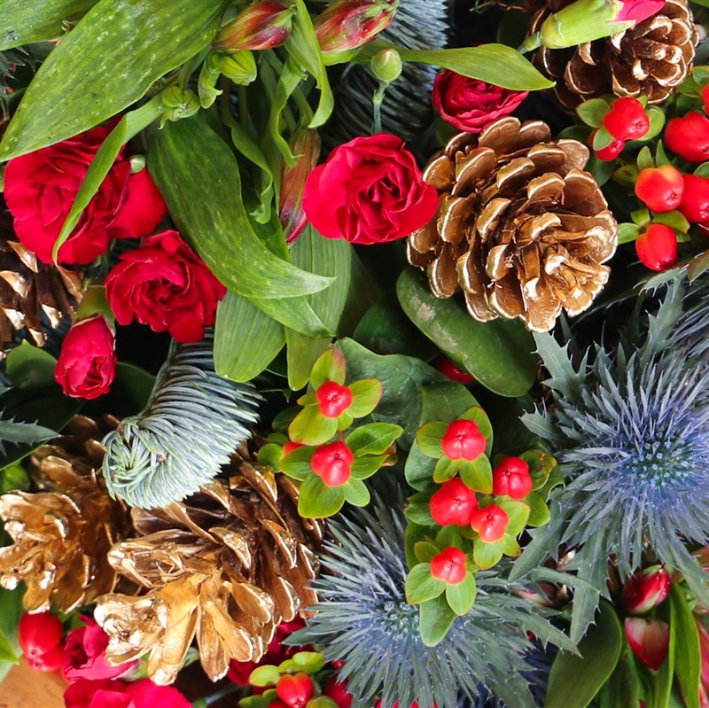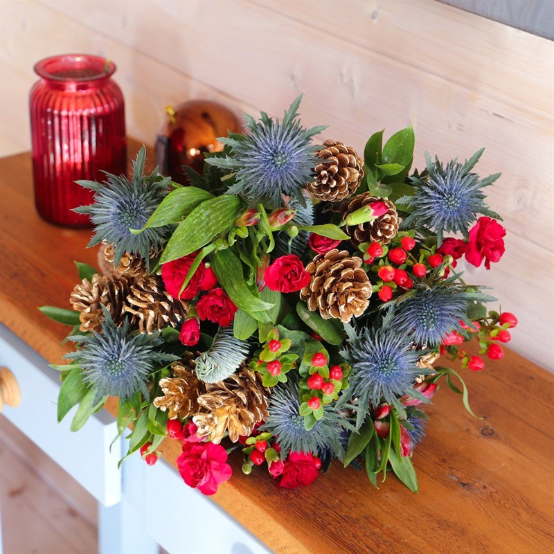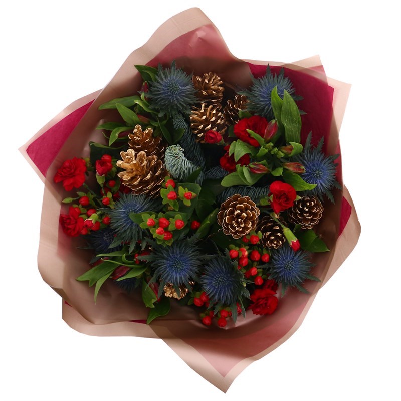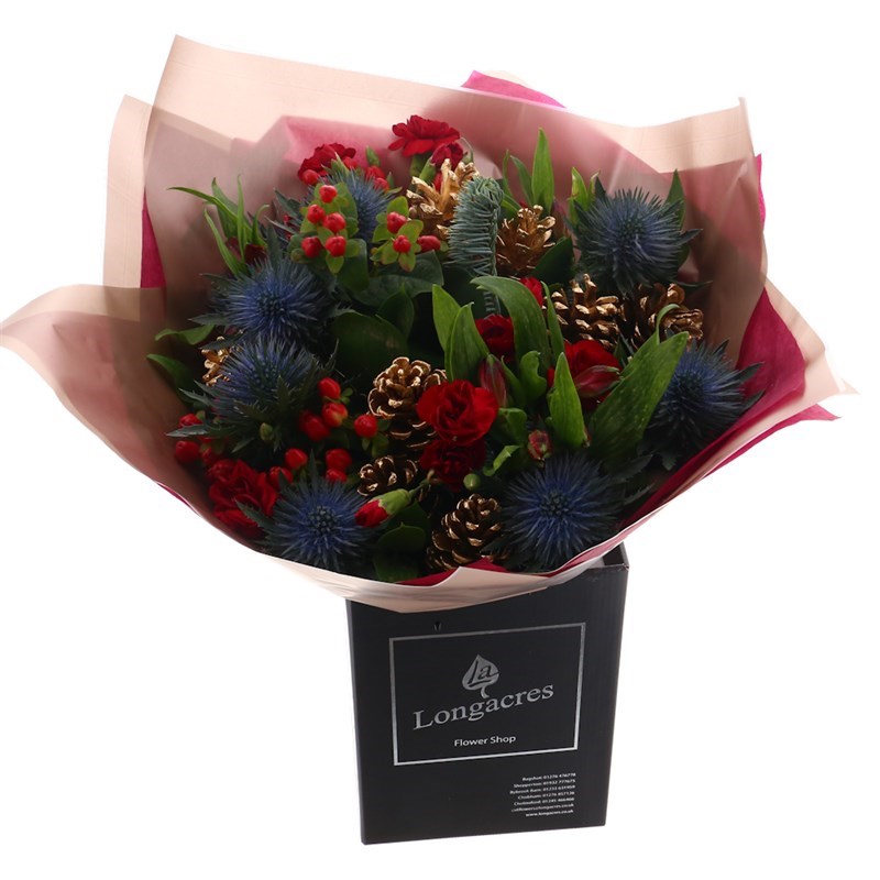 About this arrangement: Consists of Blue Thistle, Red Hypericum Berries, Burgundy Spray Carnations, Red Alstromeria with seasonal decorations and foliage. All of our bouquets are set amongst a mixure of seasonal foliages beautifully wrapped in tissue paper in a presentation box. As well as this, their stems are kept in water, so our flowers will stay fresh for their journey.