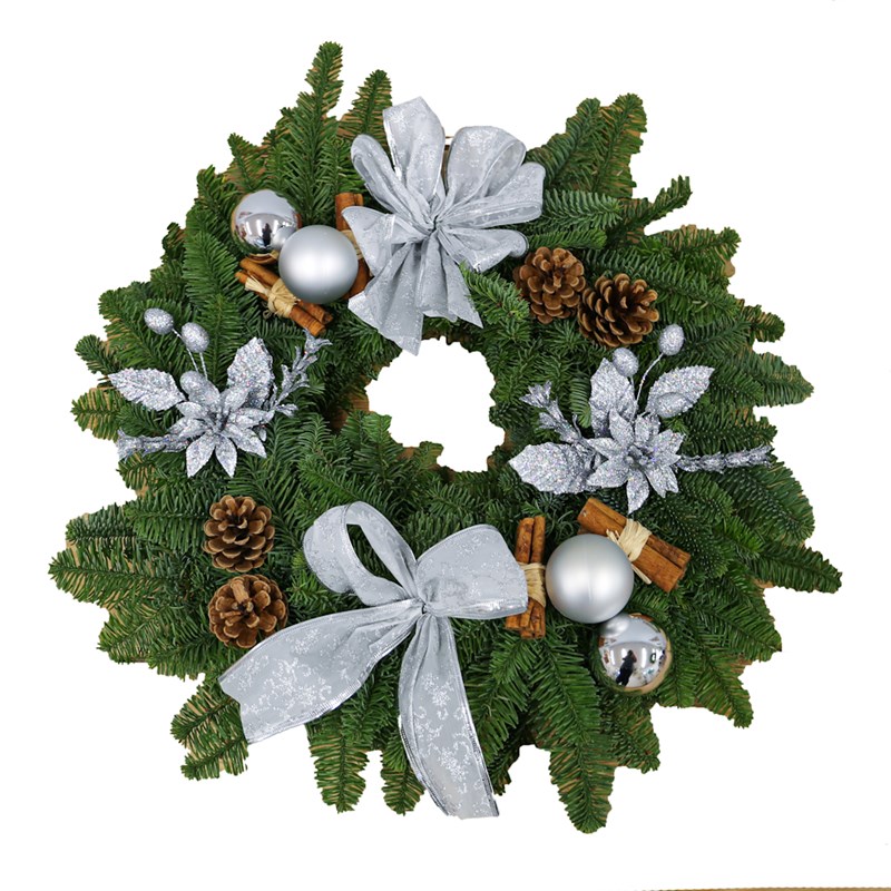 Our Silver Christmas Door Wreath is 12 inches across. It comes dressed with a selection of baubles, natural cones, cinnamon and other festive decorations with a silver bow.