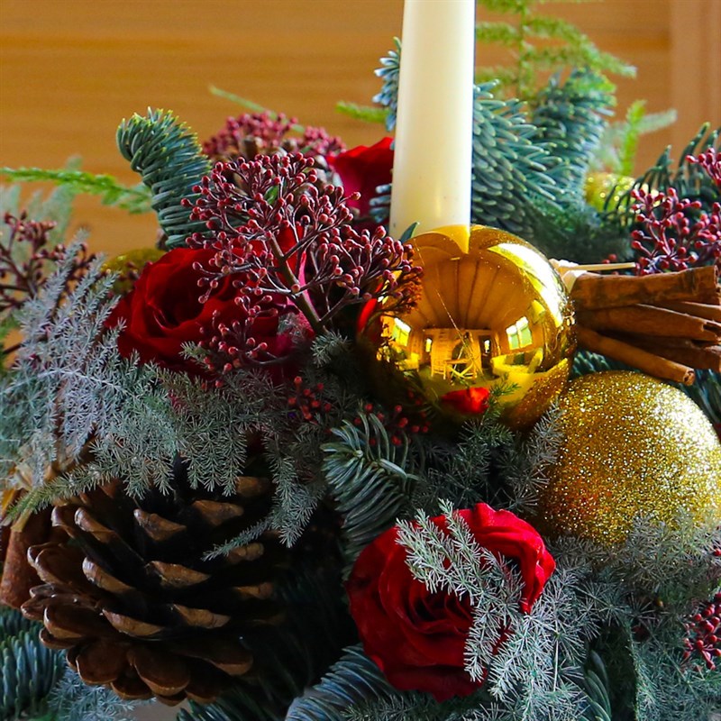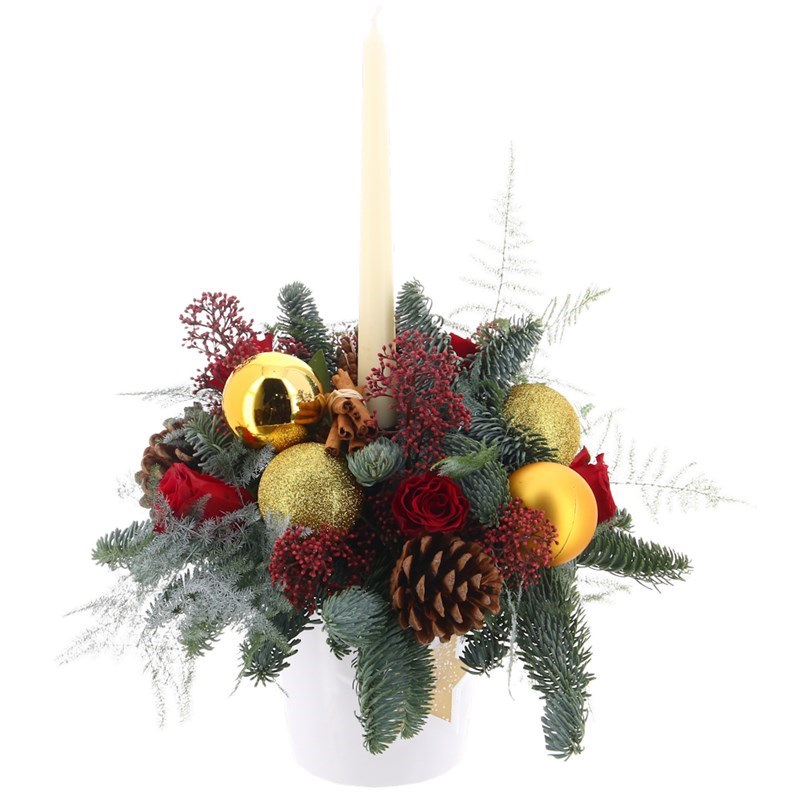About this arrangement: Consists of Spruce, White Asparagus Fern, Skimmia, and Candles. Set amongst seasonal foliages and seasonal decorations.