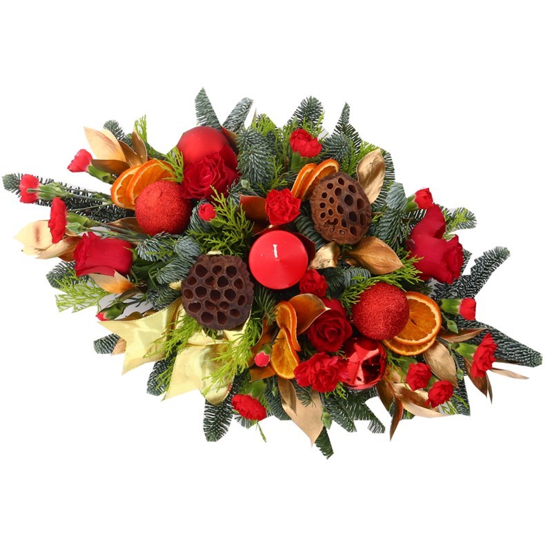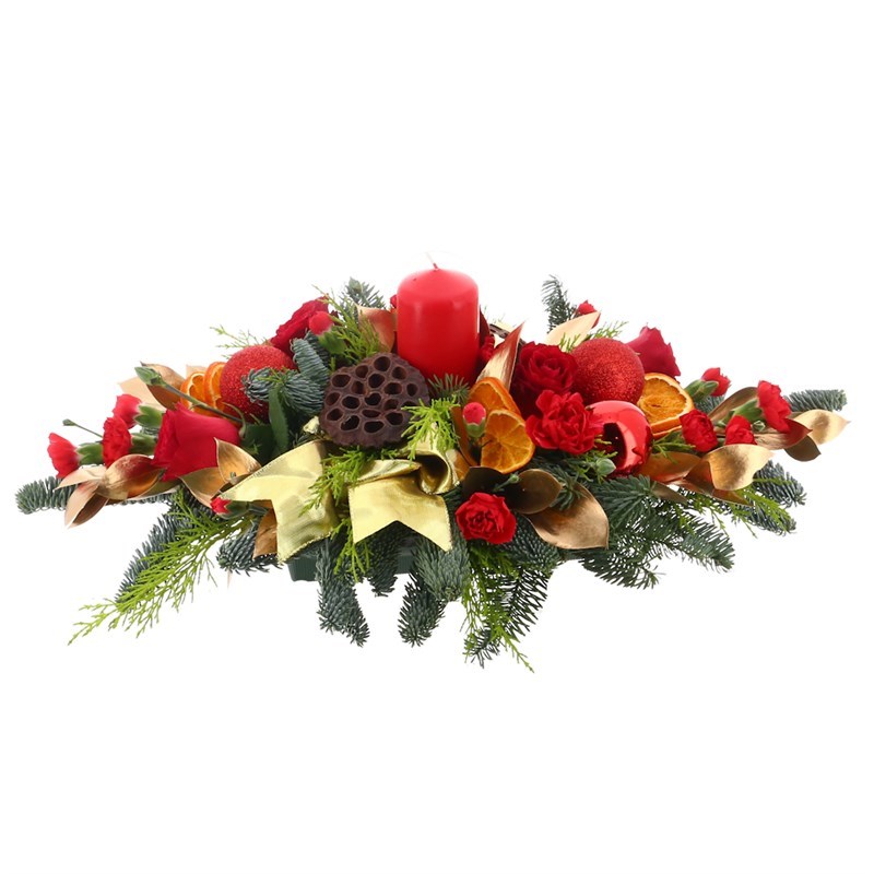 About this arrangement: Consists of Spruce, Lotus, Ruscus, Red Spray Carnations and Candles. Set amongst seasonal foliages and seasonal decorations.