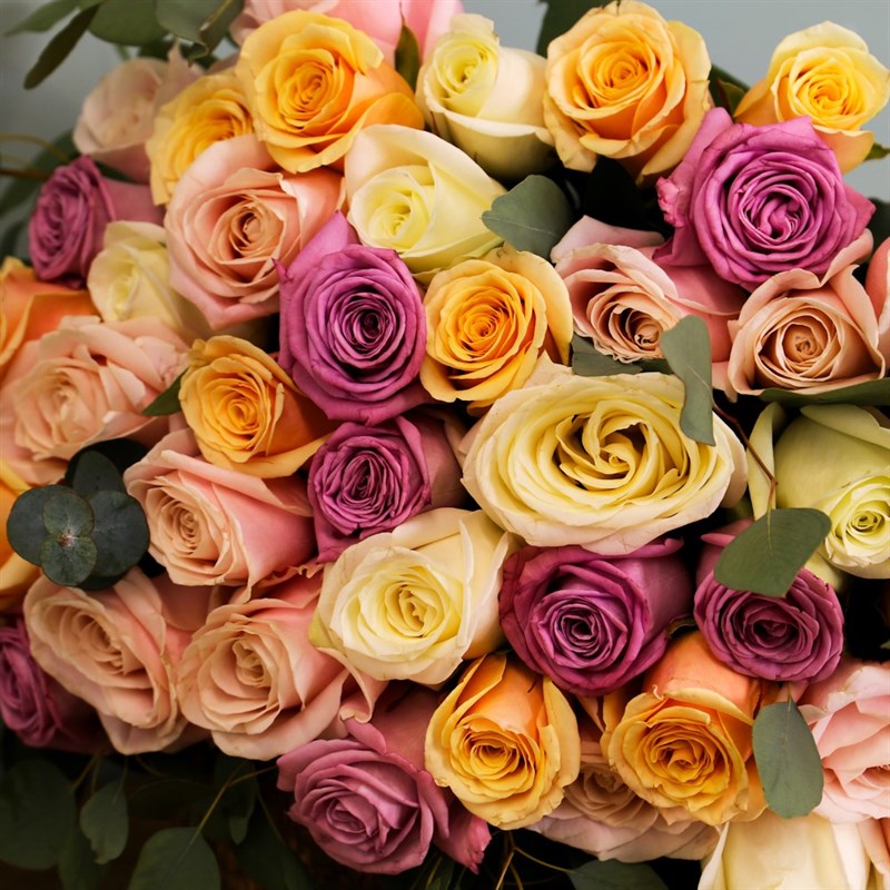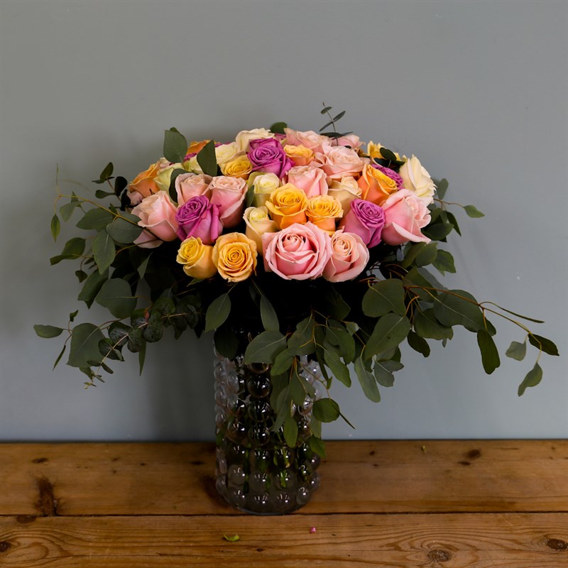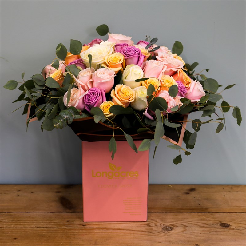 This bouquet consists of long stem roses in a mixture of pastel colours with eucalyptus, set amongst a mixture of seasonal foliage and beautifully gift-wrapped in a presentation box.