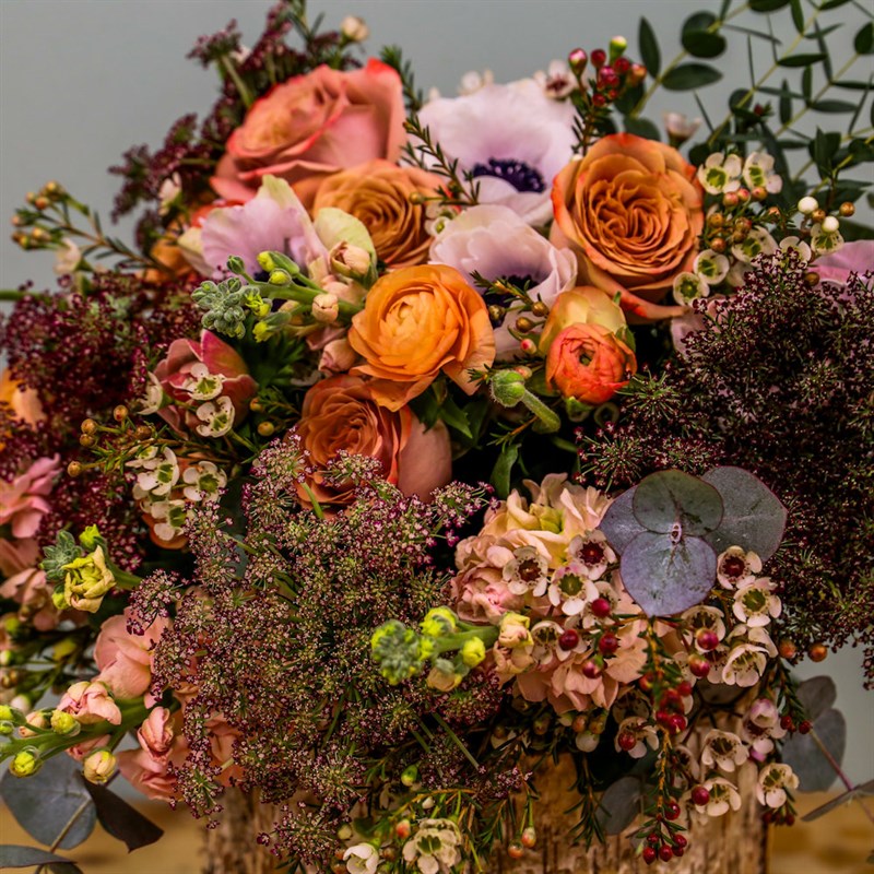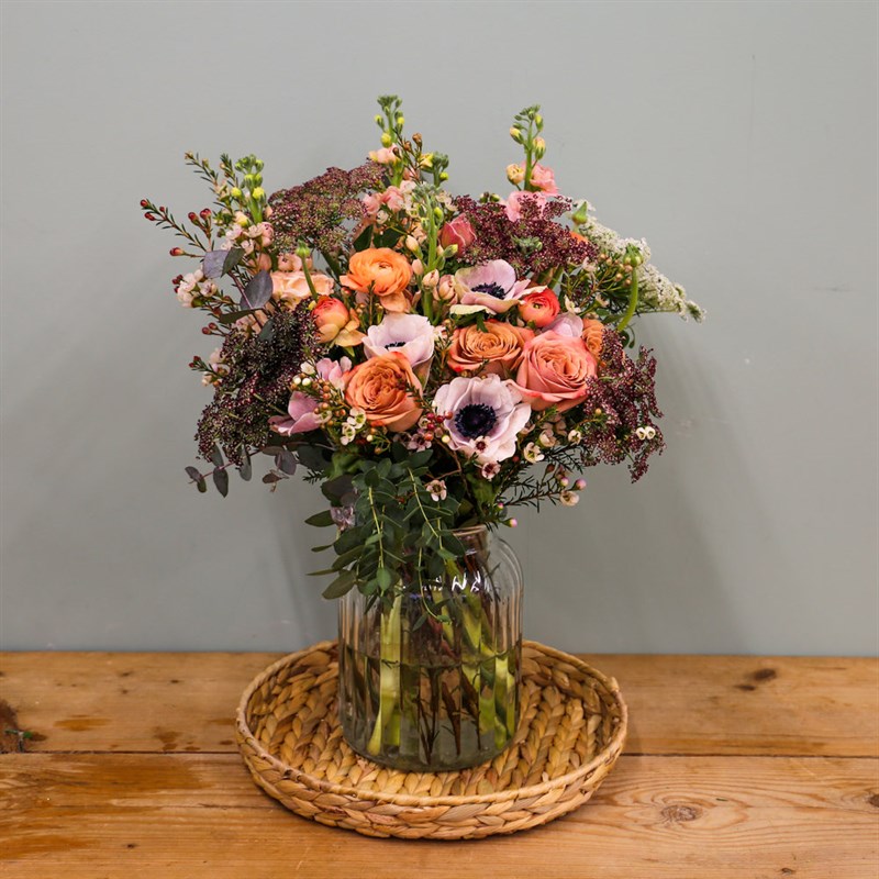 About this arrangement: Gift someone this beautiful floral handtied arrangement. Consists of white anemone, peach ranunculus, cappuccino roses, queen Anne's lace, white wax flower and peach stocks. All of our bouquets are set amongst of seasonal foliages, beautifully wrapped in tissue paper in a presentation box. As well as this, their stems are kept in water, so our flowers will stay fresh for their journey.