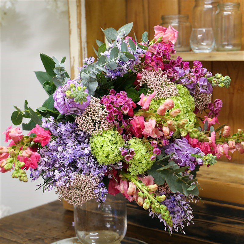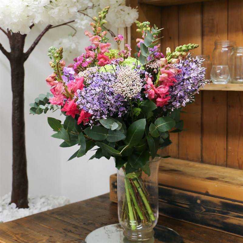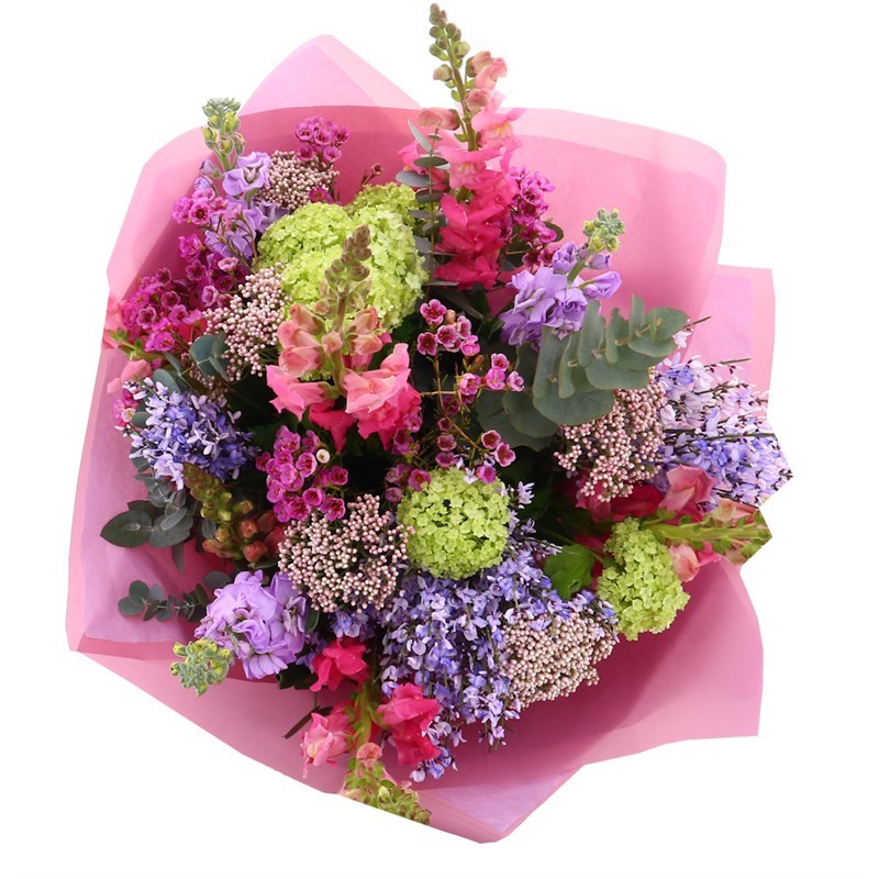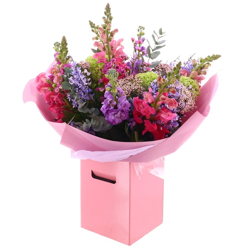 About this arrangement: Gift someone this beautiful floral handtied arrangement. Consists of Lilac Stocks, Cerise Pink Wax Flower, Viburnum, Lilac Genista, Pink Rice Flower and Pink Antirinum. All of our bouquets are set amongst of seasonal foliages, beautifully wrapped in tissue paper in a presentation box. As well as this, their stems are kept in water, so our flowers will stay fresh for their journey.
