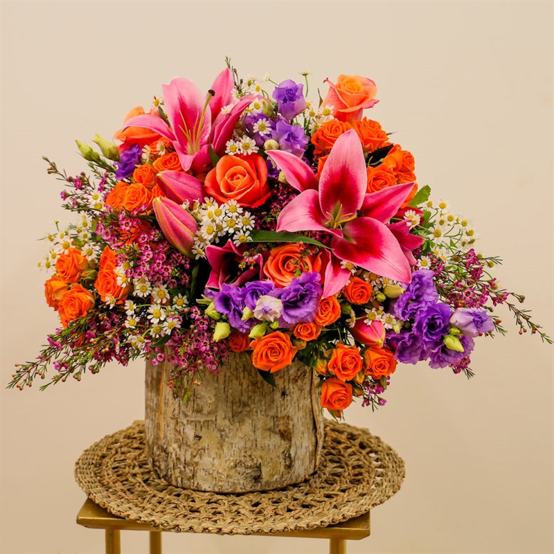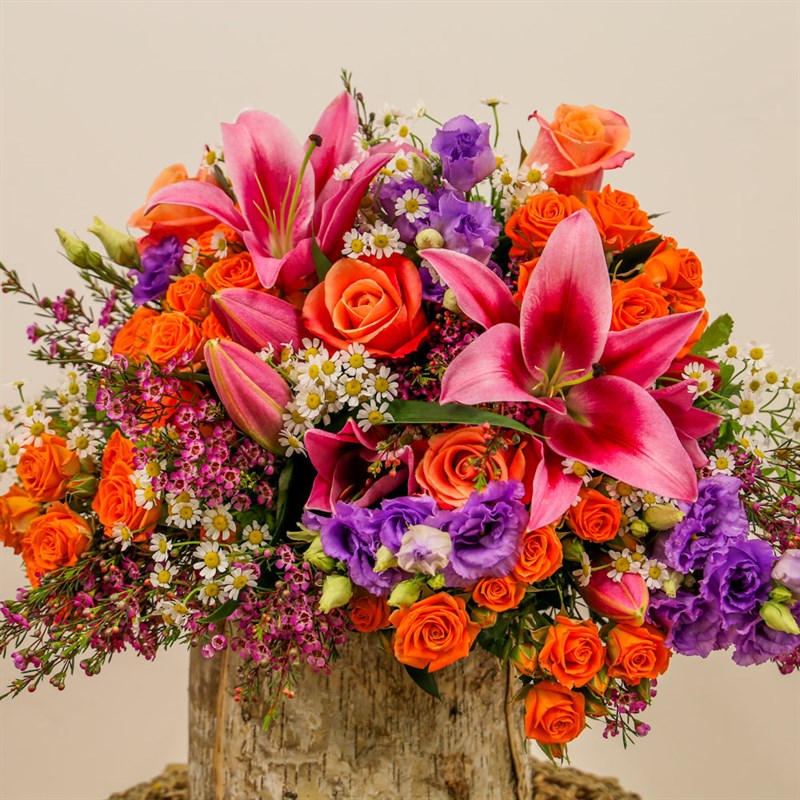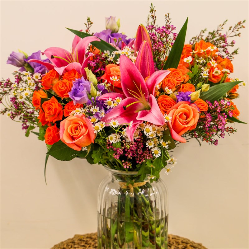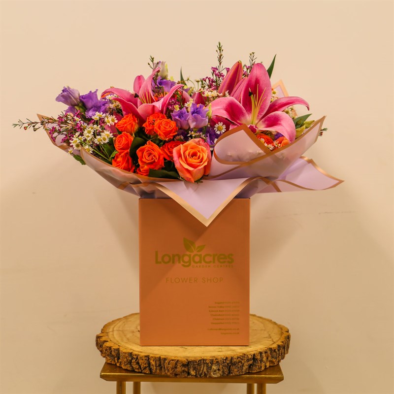 About this arrangement: Gift someone this beautiful floral handtied arrangement. Consists of bright pink lilies, daisy tanacetum, miss piggy roses, orange spray roses, cerise wax flowers and lilac lisianthus. All of our bouquets are set amongst of seasonal foliages beautifully wrapped in tissue paper in a presentation box. As well as this, their stems are kept in water, so our flowers will stay fresh for their journey.