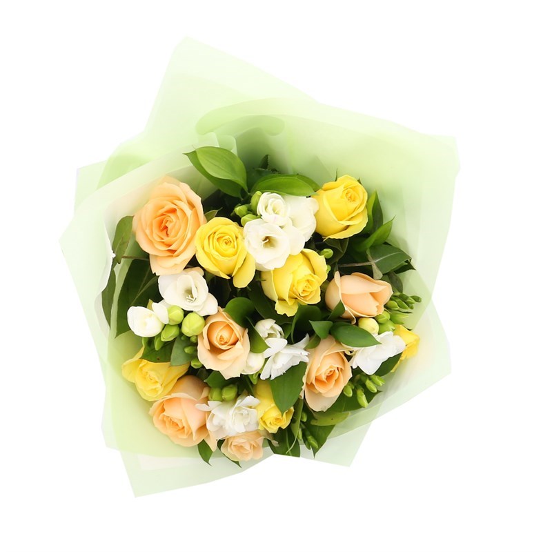 About this arrangement: Gift someone this beautiful floral handtied arrangement. Consists of Short Stem Peach Roses, Short Stem Yellow Roses and White Freesia. All of our bouquets are set amongst of seasonal foliages, beautifully wrapped in tissue paper in a presentation box. As well as this, their stems are kept in water, so our flowers will stay fresh for their journey.