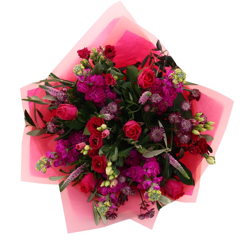 About this arrangement: Gift someone this beautiful floral handtied arrangement. Consists of Roses, Lisianthus, Veronica,Pink Stocks and Astrantia.