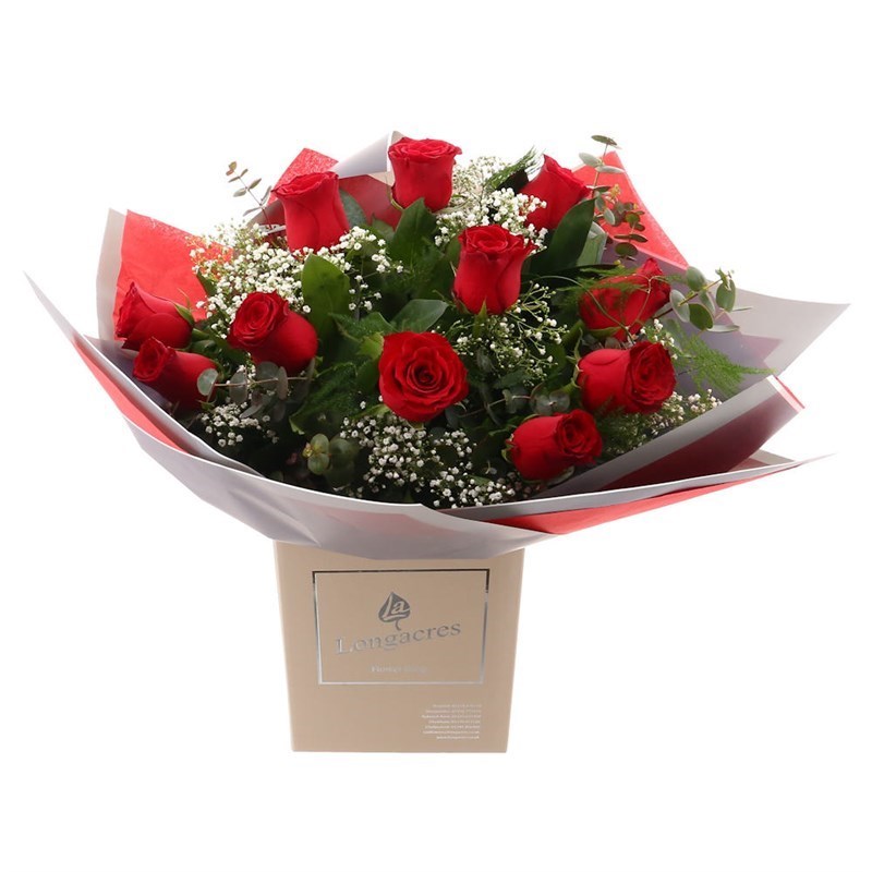 12 Short stem red roses and white gypsophilia, set amongst seasonal foliage