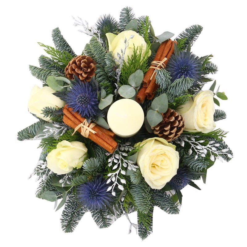 About this arrangement: Consists of Spruce, White Roses Short Stem, Blue Thistle and Candles. Set amongst seasonal foliages and seasonal decorations.