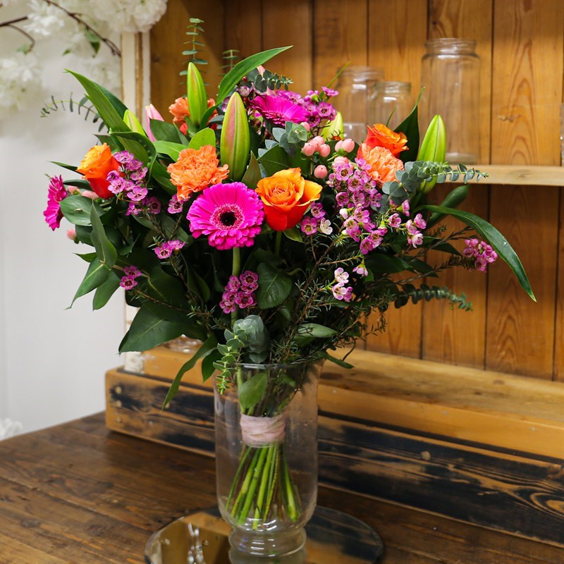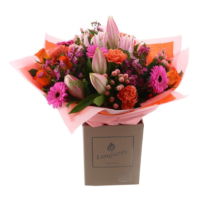 This Bouquet consists of Pink Lily, Orange Rose, Pink Hypericum Berry, Cerise Germini, Orange Carnations and Pink Waxflower. Set amongst a mixture of seasonal foliage and beautifully gift wrapped in a presentation box.