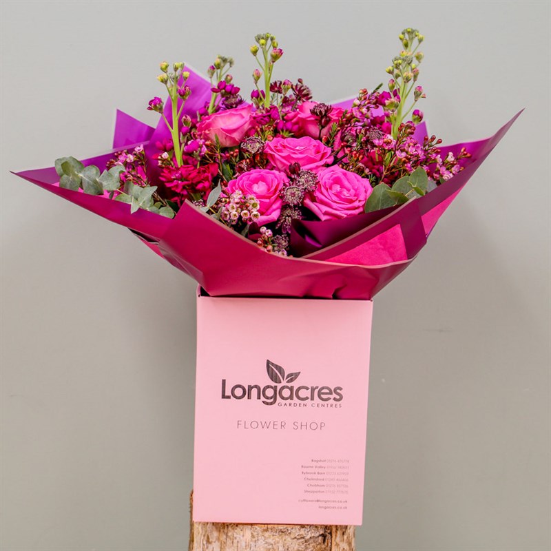 About this arrangement: Gift someone this beautiful floral handtied arrangement. Consists of roses, stocks, astrantia and wax flower set amongst of seasonal foliage beautifully wrapped in tissue paper in a presentation box. As well as this, their stems are kept in water, so our flowers will stay fresh for their journey.
