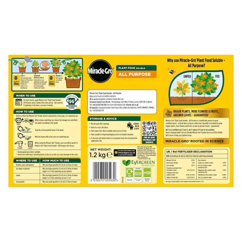 Miracle-Gro® Plant Food Soluble - All Purpose is a unique mix of 10 micro nutrients to ensure healthy growth. For stunning displays just feed every two weeks from March to September. This product is easy to apply using the Miracle-Gro® Feeder or with a watering can.