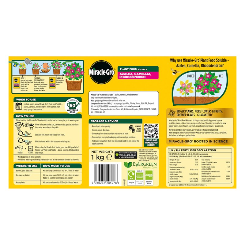 Miracle-Gro® Plant Food Soluble - Azalea, Camellia, Rhododendron is a specially formulated plant food, just what acid-loving or lime-hating plants need for healthy growth. Contains sequestered iron which is essential to prevent leaf yellowing and feeds for up to 2 weeks.