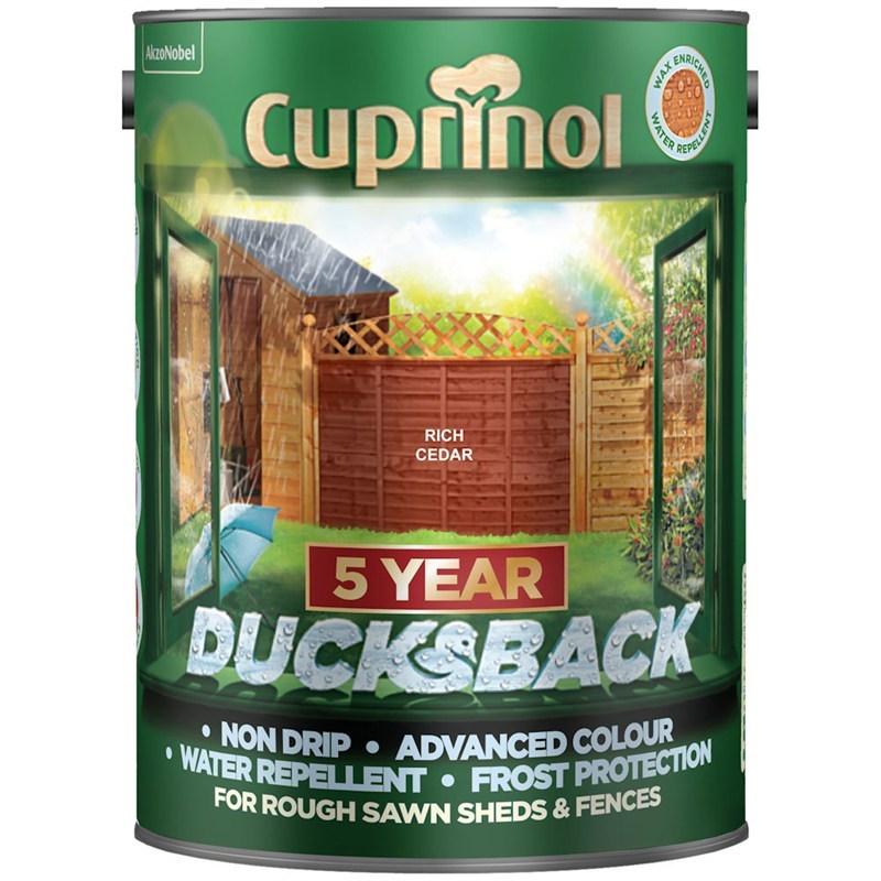 Cuprinol 5 Year Ducksback has an advanced, wax enriched and non-drip formulation, that colours and weatherproofs sheds and fences for up to 5 years. Cuprinol 5 year Ducksback is quick drying, low odour and safe to use around plants and pets.