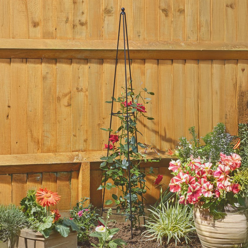 - Classic, sturdy black metal obelisk designed to maximise vertical space