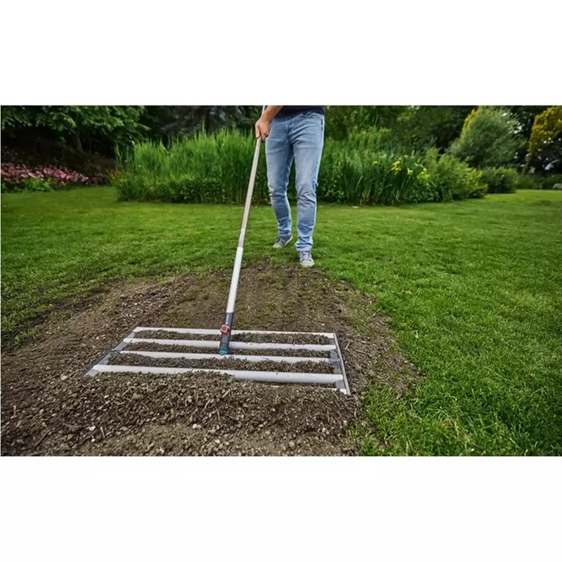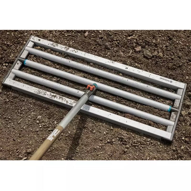 Ideal for levelling soil or spreading sand across lawns, the Gardena Combisystem Levelling Rake provides fast and efficient lawn preparation. With a wide 76 cm working width, it allows you to quickly distribute soil or sand when creating new lawn areas, sanding existing grass, levelling uneven ground or working after scarifying. Manufactured from high-quality coated steel, the levelling rake is built for strength and durability when moving large amounts of soil or sand.