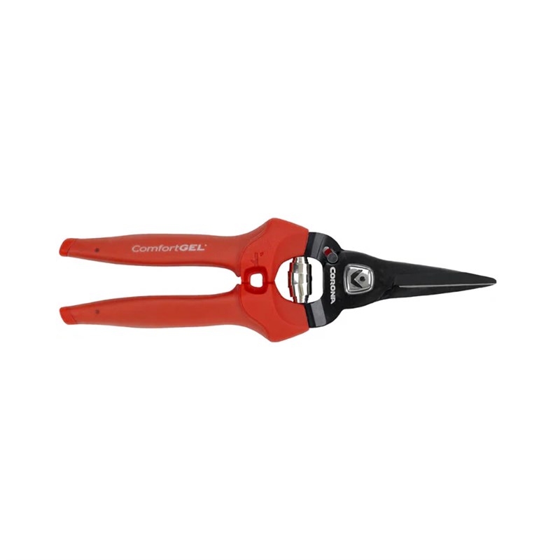 The Corona Fruit & Flower Pruner with ComfortGEL® grip features a shaped blade which makes it easy to isolate and target stems. The ergonomically shaped grips maximise comfort and control and the specially coated non-stick blade gives a smooth cutting performance.