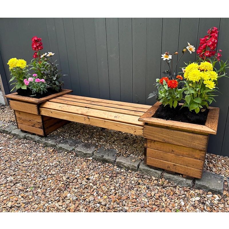 This wooden outdoor bench with planter ends is the perfect way to add colour and a comfortable seat to your garden!
