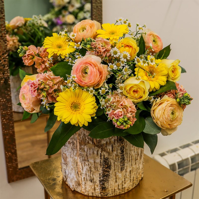 This bouquet contains: roses, gerbera, daisies, ranunculus and stocks.