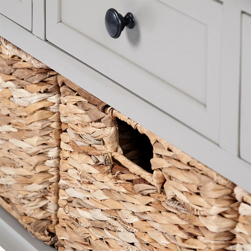With three wood drawers and 4 banana leaf storage baskets, this unit is the perfect stylish storage solution for hallways or indeed any living space. The putty coloured finish adds a touch of sophistication which is softened by beautiful woven baskets and makes this piece a stylish addition to any room in the home where extra storage is required.