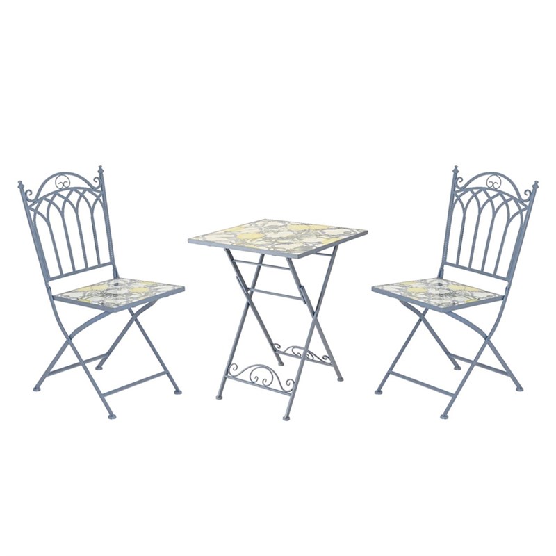 The Kaemingk Sorrento Mosaic Bistro Set is a stylish and comfortable outdoor seating option for two people. It includes two folding chairs and a folding table, all made with durable iron frames and a unique mosaic design.