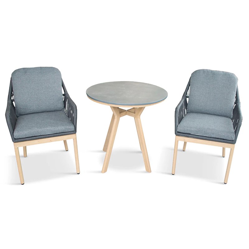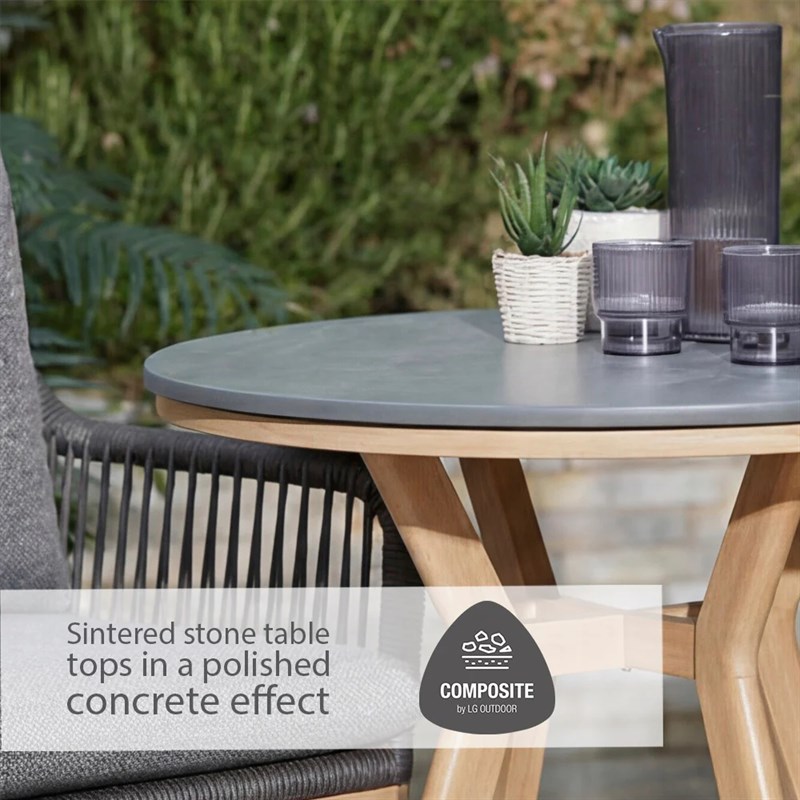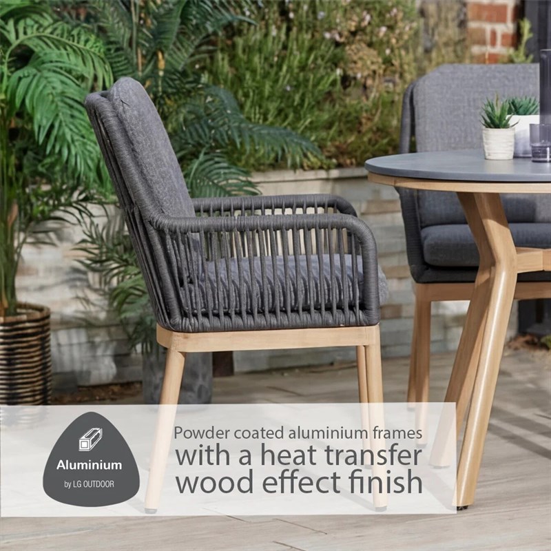 The Peru Charcoal Everope Collection combines clean, contemporary lines with classic outdoor durability. Its tightly woven PE rope forms a striking, modern pattern, while the stone-effect Stone-Tek tabletops contrast beautifully with wood-effect frames for a sophisticated look.