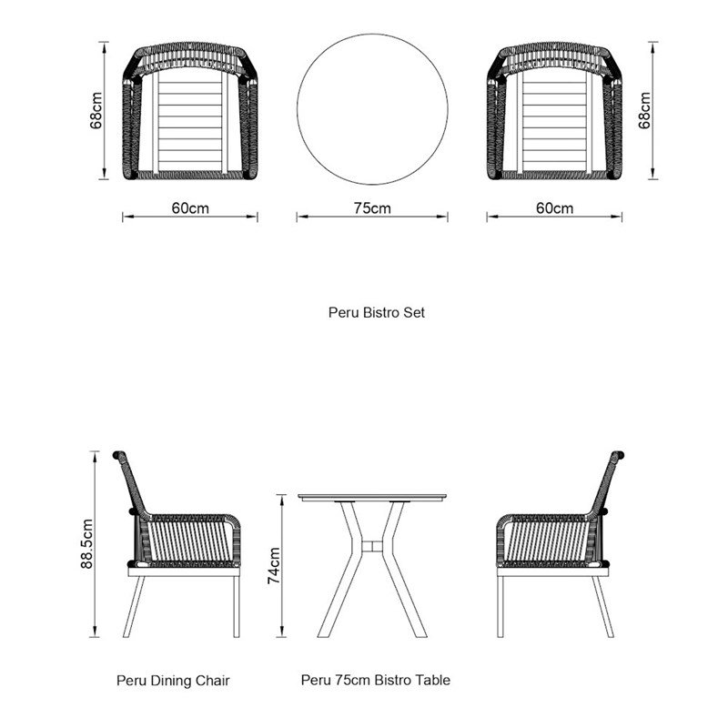 Set includes 2 x dining chair and 1 x round bistro table.