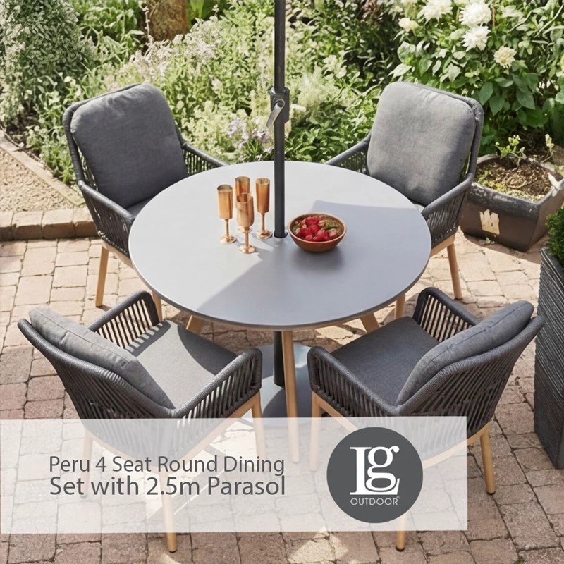 Set includes 4 x dining chairs, 1 x round dining table, 1 x 2.5m grey parasol and 1 x 12kg parasol base.