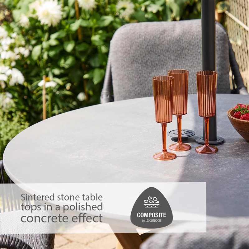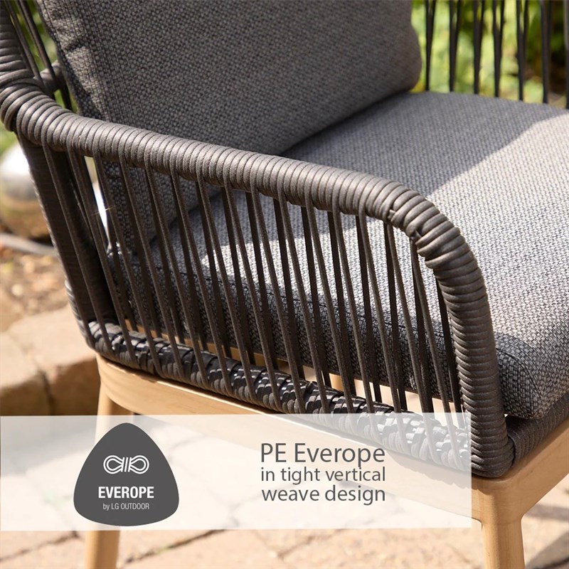 The Peru Charcoal Everope Collection combines clean, contemporary lines with classic outdoor durability. Its tightly woven PE rope forms a striking, modern pattern, while the stone-effect Stone-Tek tabletops contrast beautifully with wood-effect frames for a sophisticated look.