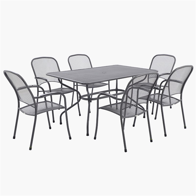 The Carlo Rectangular 6 Seater Dining Set offers a sophisticated design that will provide plenty of space for you and your guests to sit back and enjoy some alfresco dining in the sun. Comprising 6 stackable garden chairs, featuring a chic mesh design and a dining table. The grey chairs boast a sleek design with a curved back and arms for all-day comfort, while the table benefits from a hole in the centre for the placement of a parasol.