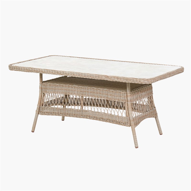 The dining table is topped with tempered glass with a marble effect, adding a refined touch while providing a smooth, easy-to-clean surface that complements the woven design. The table top has a hole in the centre, enabling placement for a parasol, to keep you shaded on those sunny days.
