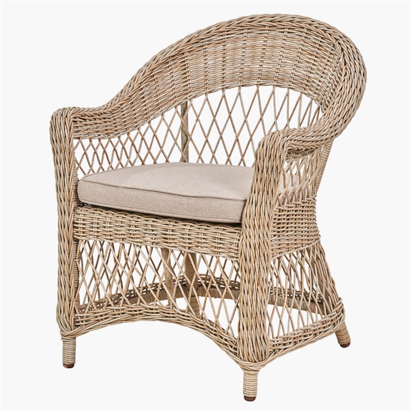 Constructed with a durable, powder-coated aluminium frame in a soft sand-coloured finish and wrapped in a matching round wicker weave, the comfortable chairs are completed with sand Olefin-upholstered cushions. Olefin fabric, a trusted choice for outdoor furnishings, is made from synthetic fibres that are highly resistant to stains and fading, and quick-drying—perfect for all-weather use.