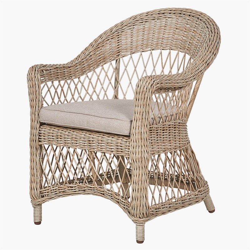 Constructed with a durable, powder-coated aluminium frame in a soft sand-coloured finish and wrapped in a matching round wicker weave, the comfortable chairs are completed with sand Olefin-upholstered cushions. Olefin fabric, a trusted choice for outdoor furnishings, is made from synthetic fibres that are highly resistant to stains and fading, and quick-drying—perfect for all-weather use.