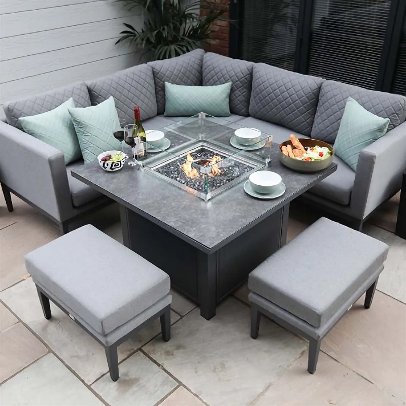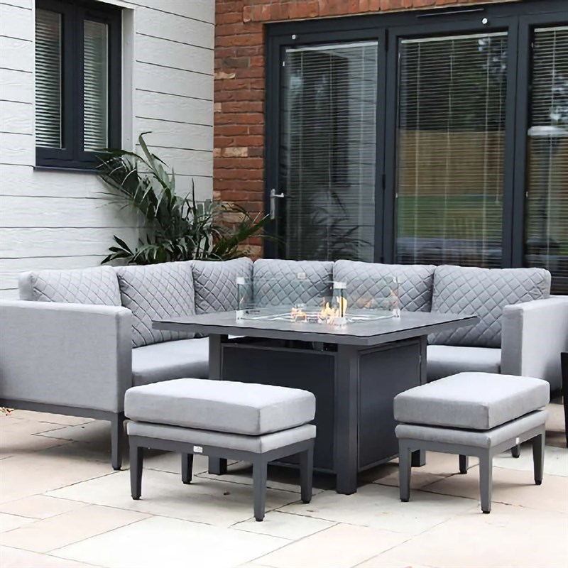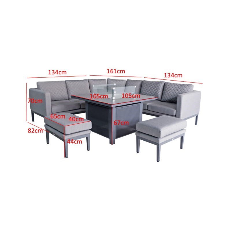 A beautiful expression of style, the Mirfield Mini Modular is designed for maximum comfort, with a playful fusion of practicality and innovation. Deep-filled seats, made with uniquely designed all-weather fabric are stain-proof, fade, UV, and mould-resistant to ensure that maximum use without worry. Accompanied by thick quick-to-dry foam that is designed to ensure constant air circulation for a complete dry in around 30 minutes. The set is accompanied by an integrated gas firepit system which will allow you to enjoy your garden furniture until the late hours. All Supremo firepits are UKCA and CE registered and will accommodate a 5kg patio gas bottle, which is enclosed underneath the table. Made with Aluminium frames, powder-coated in contemporary grey tones, to prevent rust, and durable soft furnishings, this set is perfect for all-year use.