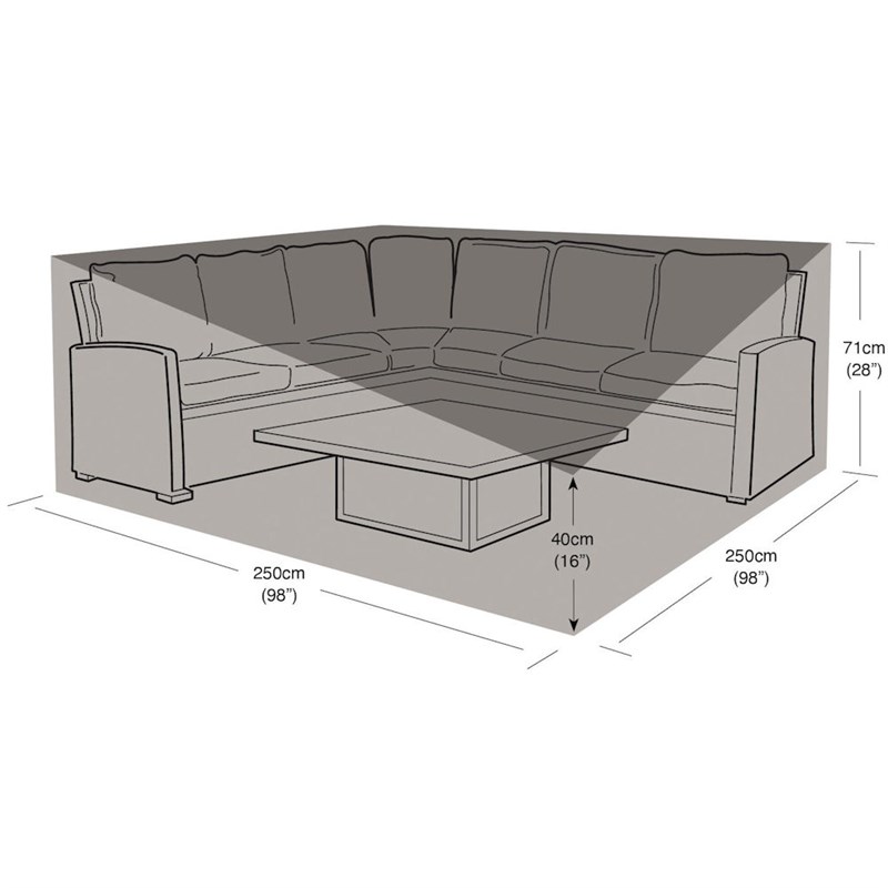 - Size Check: 250cm (98in) Long 250cm (98in) Wide 71cm (28in) High Back 40cm (16inch) High Front