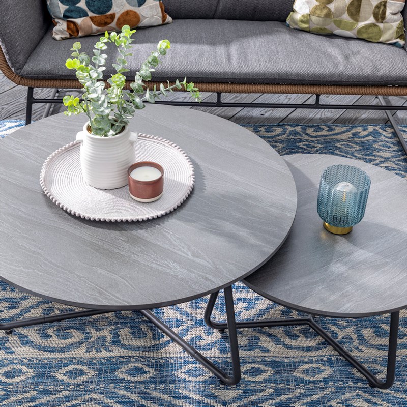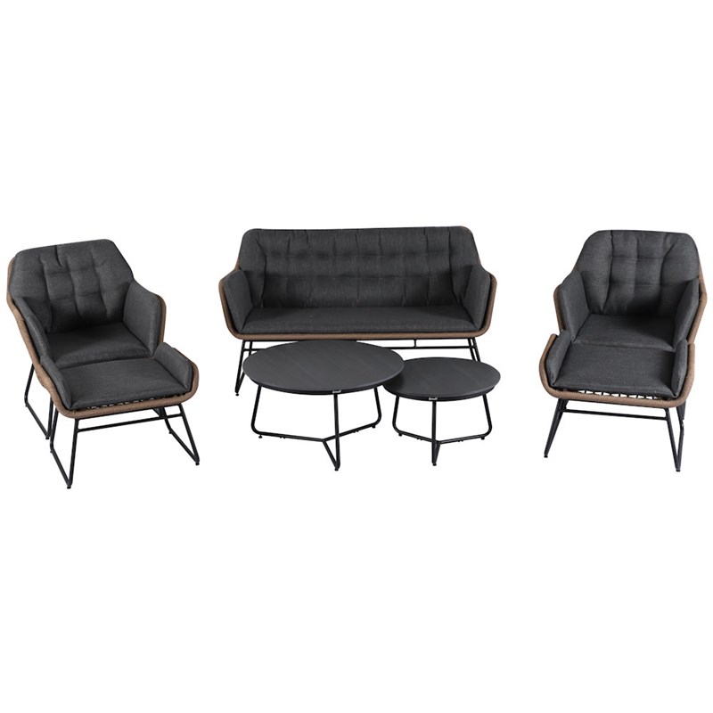 Transform your space with the Rayo 2-Seat Lounge Set — where modern design meets effortless comfort. This beautifully crafted set includes a cozy two-seater sofa, two generously cushioned lounge chairs with matching stools, and a pair of elegant, nested tables for a versatile, stylish setup. Wrapped in luxurious dark upholstery with woven detailing and sleek reinforced aluminium legs, the Rayo set exudes contemporary sophistication. Whether for a chic outdoor patio space or stylish garden room, it offers the perfect balance of comfort, durability, and design flair. Invite conversation, unwind in style, and elevate every moment with Rayo — the statement lounge set that redefines modern living.