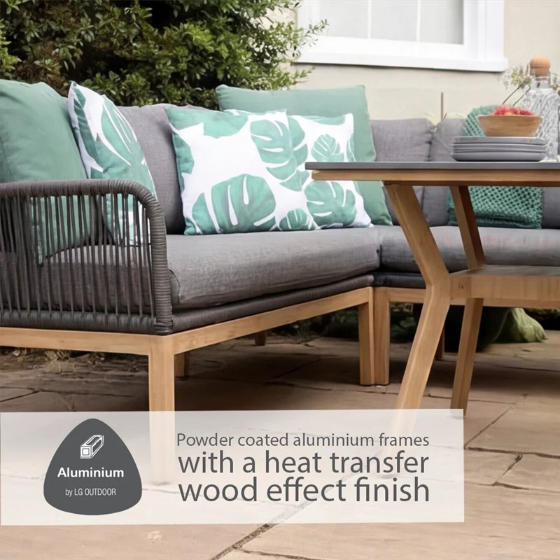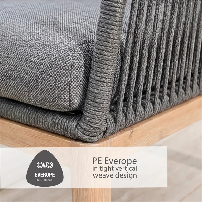 The Peru Charcoal Everope Collection combines clean, contemporary lines with classic outdoor durability. Its tightly woven PE rope forms a striking, modern pattern, while the stone-effect Stone-Tek tabletops contrast beautifully with wood-effect frames for a sophisticated look.