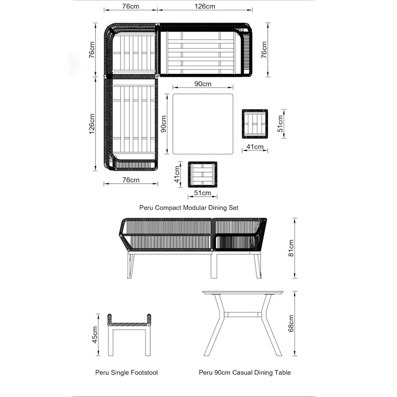 Set includes 1 x left side 2 seat modular section, 1 x right side 2 seat modular section, 1 x single seat corner modular section, 2 x footstools and 1 square dining table.