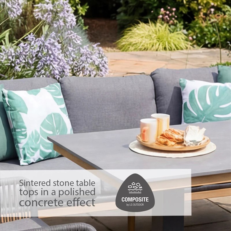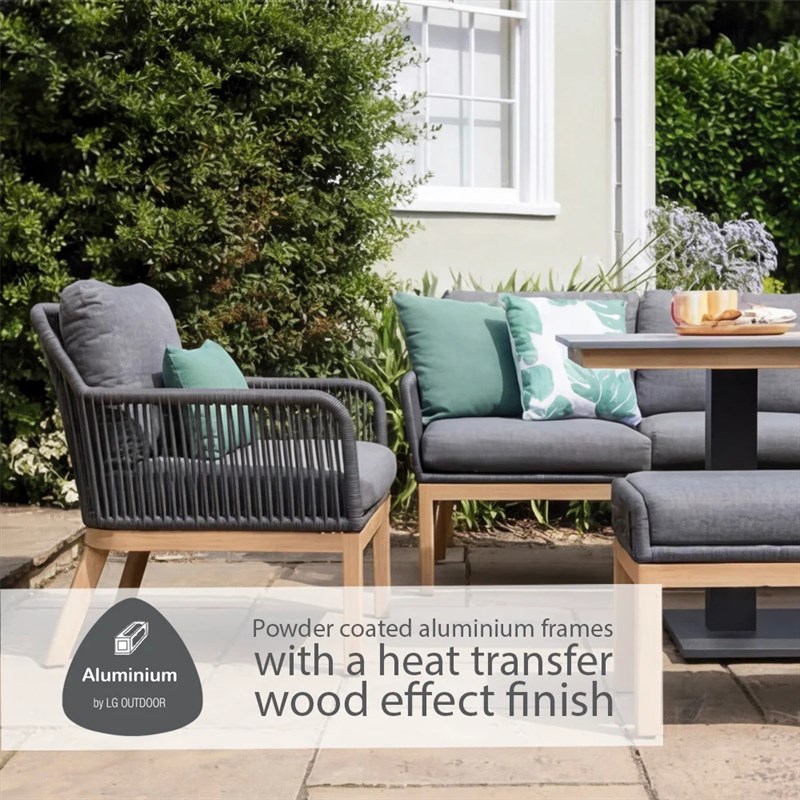 The Peru Charcoal Everope Collection combines clean, contemporary lines with classic outdoor durability. Its tightly woven PE rope forms a striking, modern pattern, while the stone-effect Stone-Tek tabletops contrast beautifully with wood-effect frames for a sophisticated look.