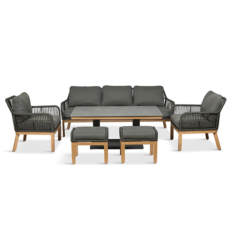 Set includes 2 x lounge chairs, 1 x 3-seat lounge sofa, 2 x footstools and 1 x rectangular height adjustable coffee/dining table.