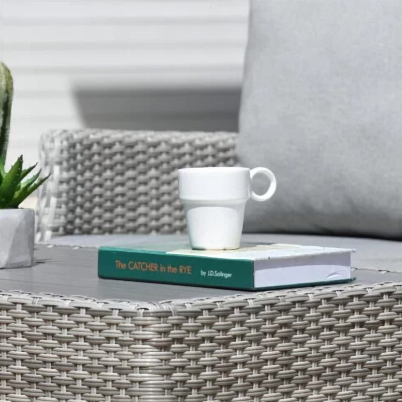 The Aruba lounge coffee ser features a delicate double woven Petan finish in a timeless tone of light grey paired with All-Weather cushions for comfort and longevity. The table tops are made from Duraboard which is weather resistant, maintenance free and highly UV-resistant