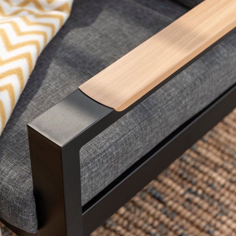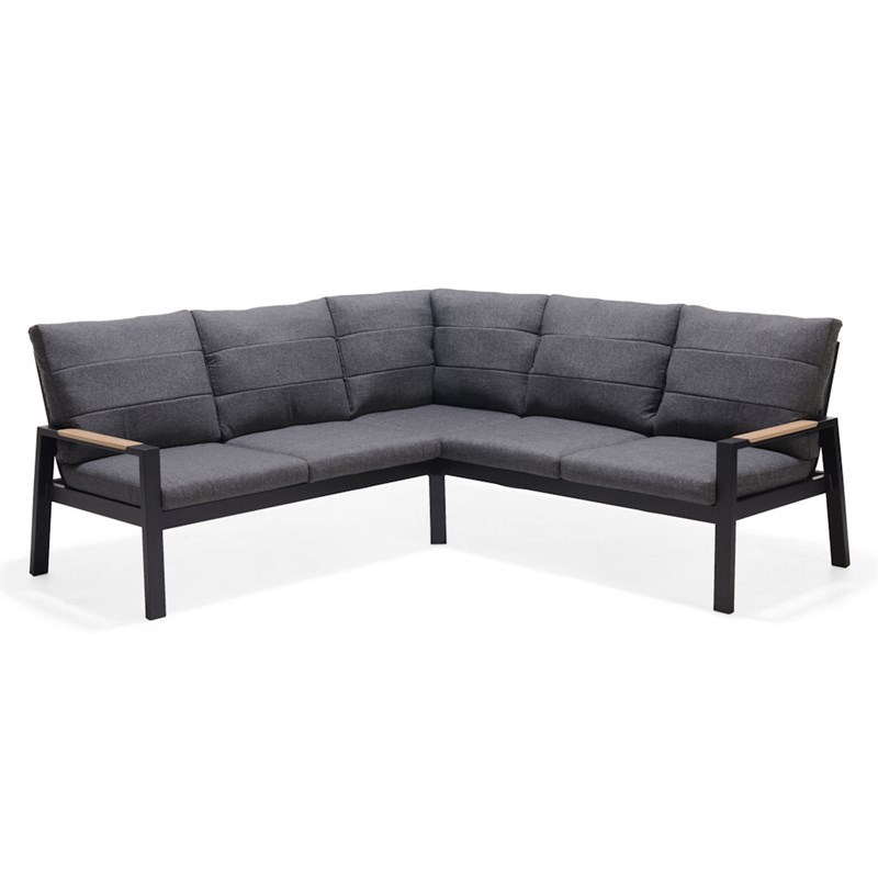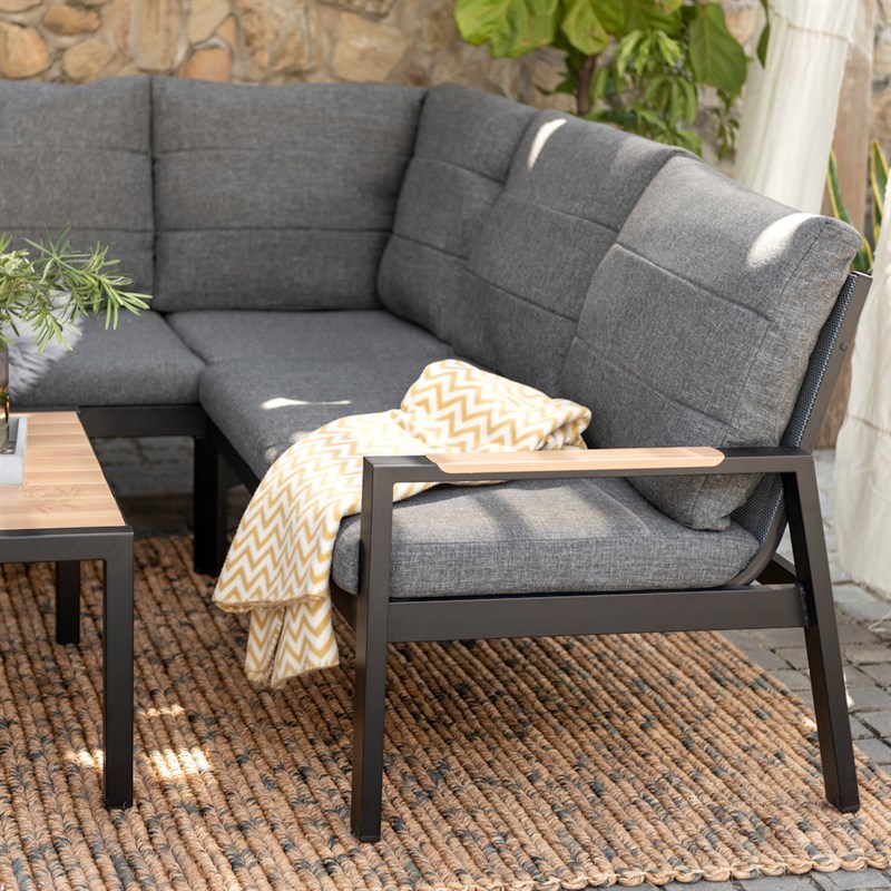 A classic sofa setup, crafted with a premium feel. The Panama Corner Sofa set delivers excellent sitting comfort in combination with zero maintenance and a very sleek design with subtle, elegant attention to detail. Black aluminium colour with sanded effect and printed wood effect armrest with Premium Olefin cushions. Spend hours in the summer sun reading a book with coffee, or have dinner alfesco surrounded by friends and family. With ample space to seat all your guests, this garden furniture set is the perfect place to enjoy a barbecue while the sun goes down.