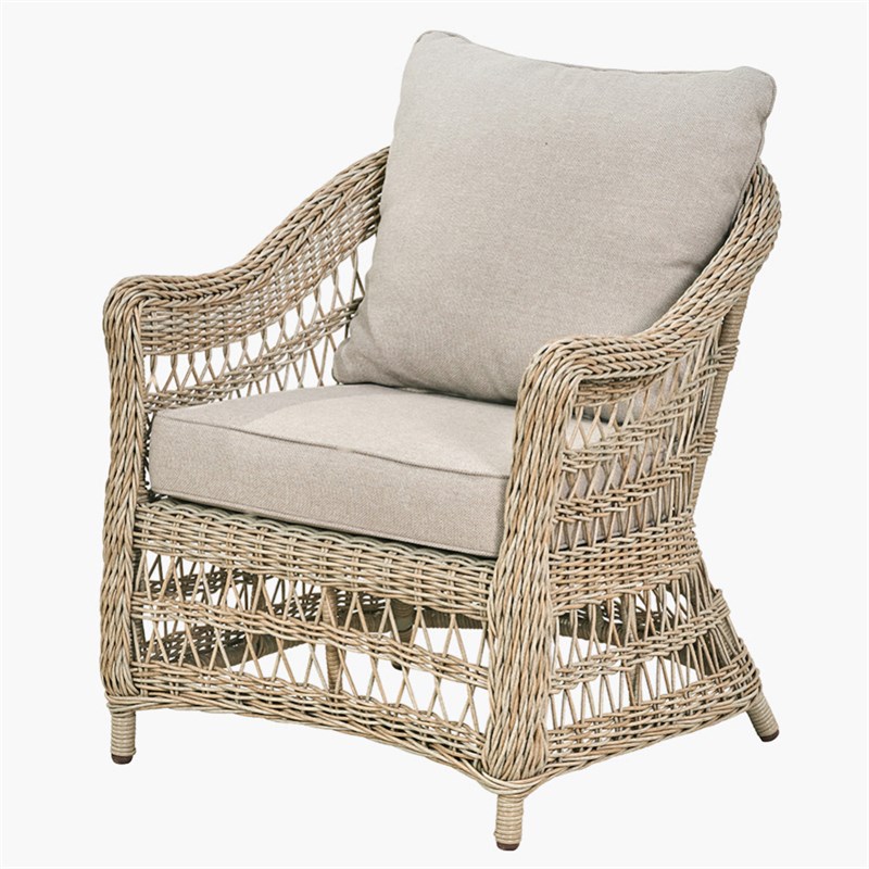 Constructed with a durable, powder-coated aluminium frame in a soft sand-coloured finish and wrapped in a matching round wicker weave, the comfortable chairs are completed with sand Olefin-upholstered cushions. Olefin fabric, a trusted choice for outdoor furnishings, is made from synthetic fibres that are highly resistant to stains and fading, and quick-drying—perfect for all-weather use.